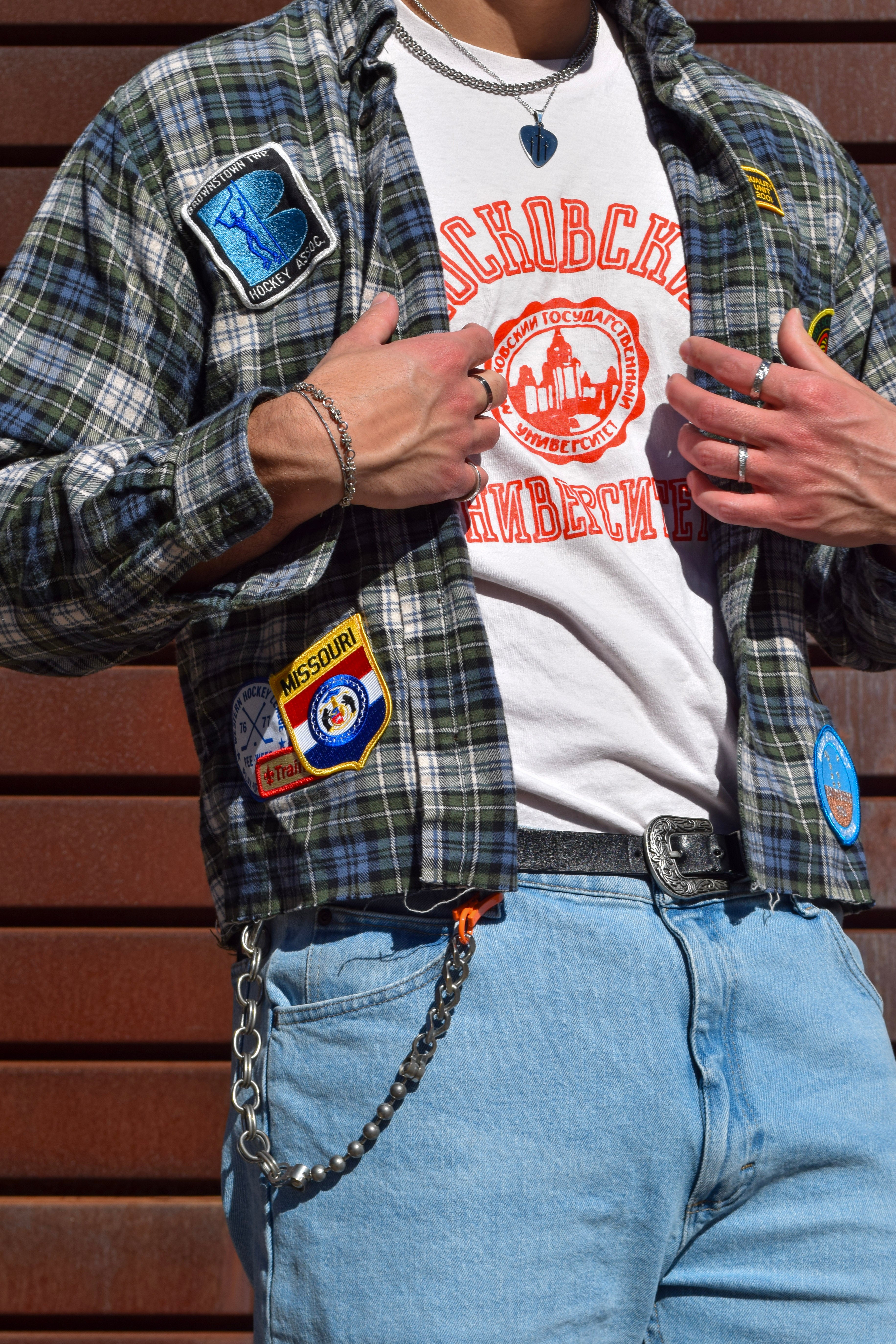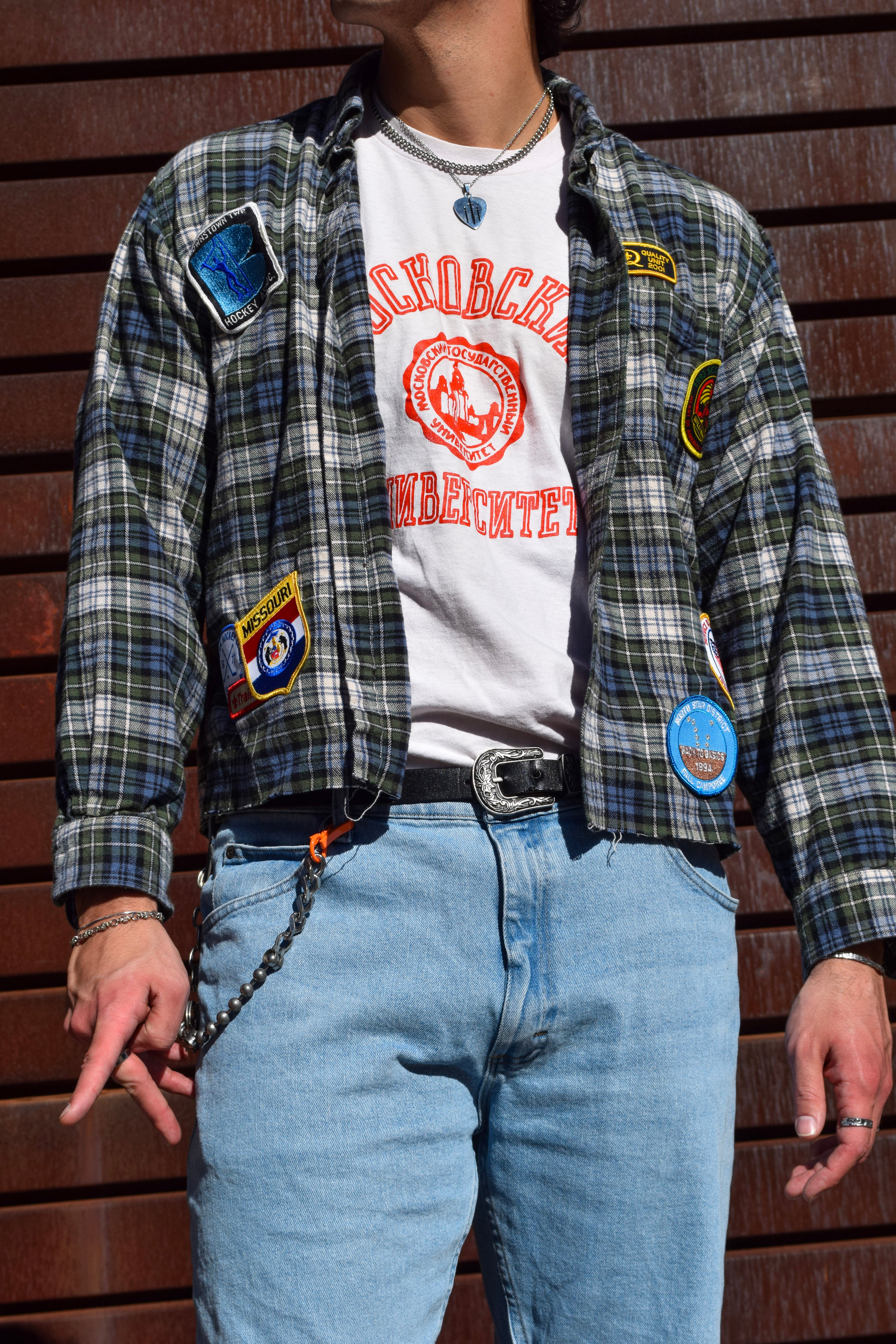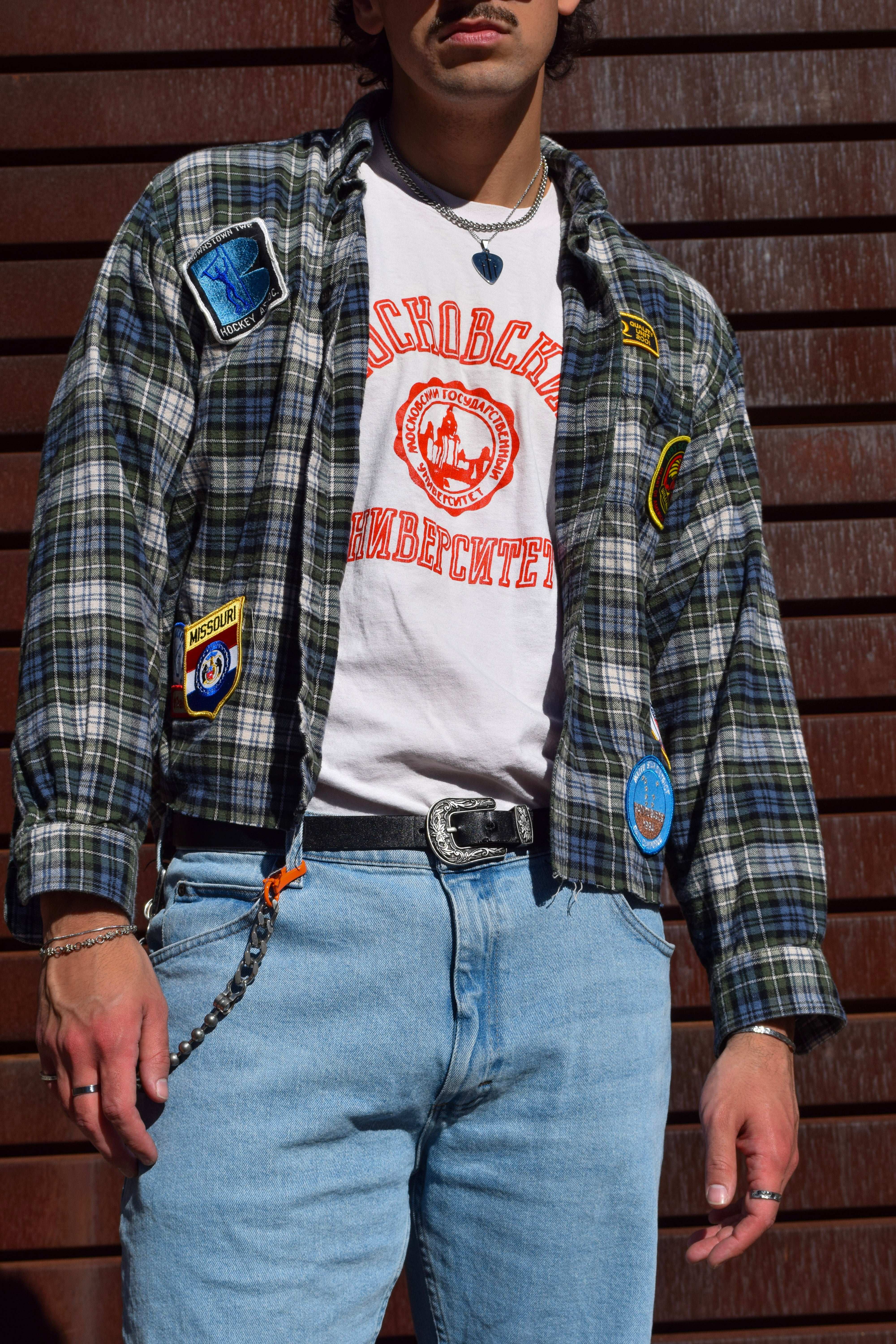Cut and sewn in Austin, Texas. Brandishing vintage patches from all over the United States of America.