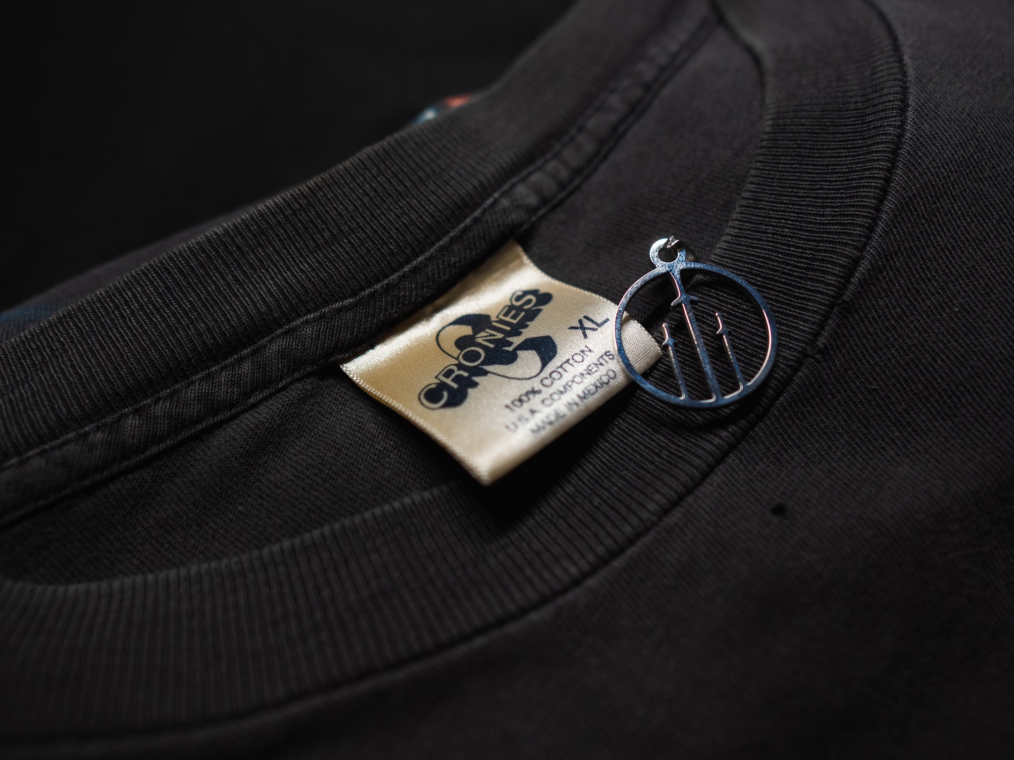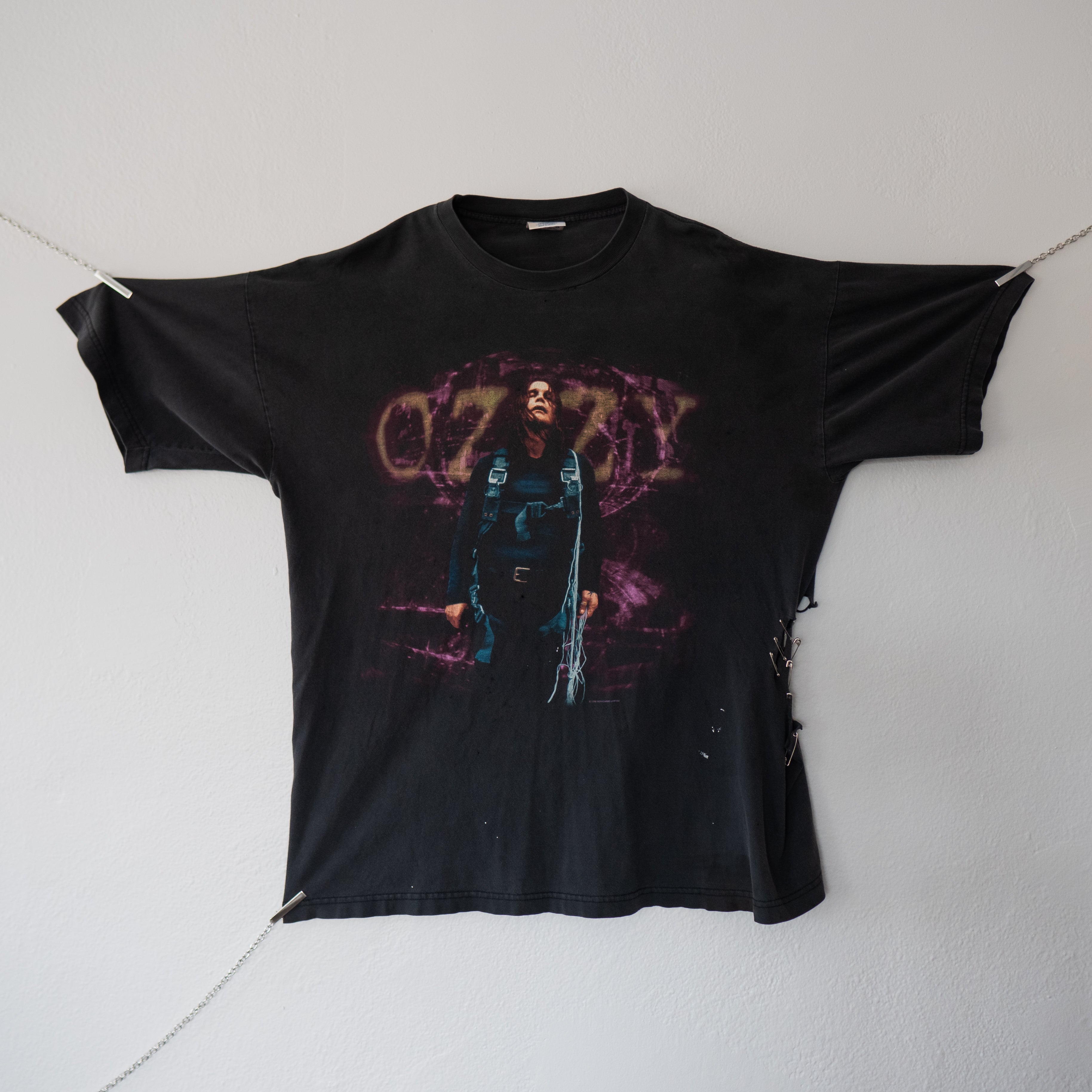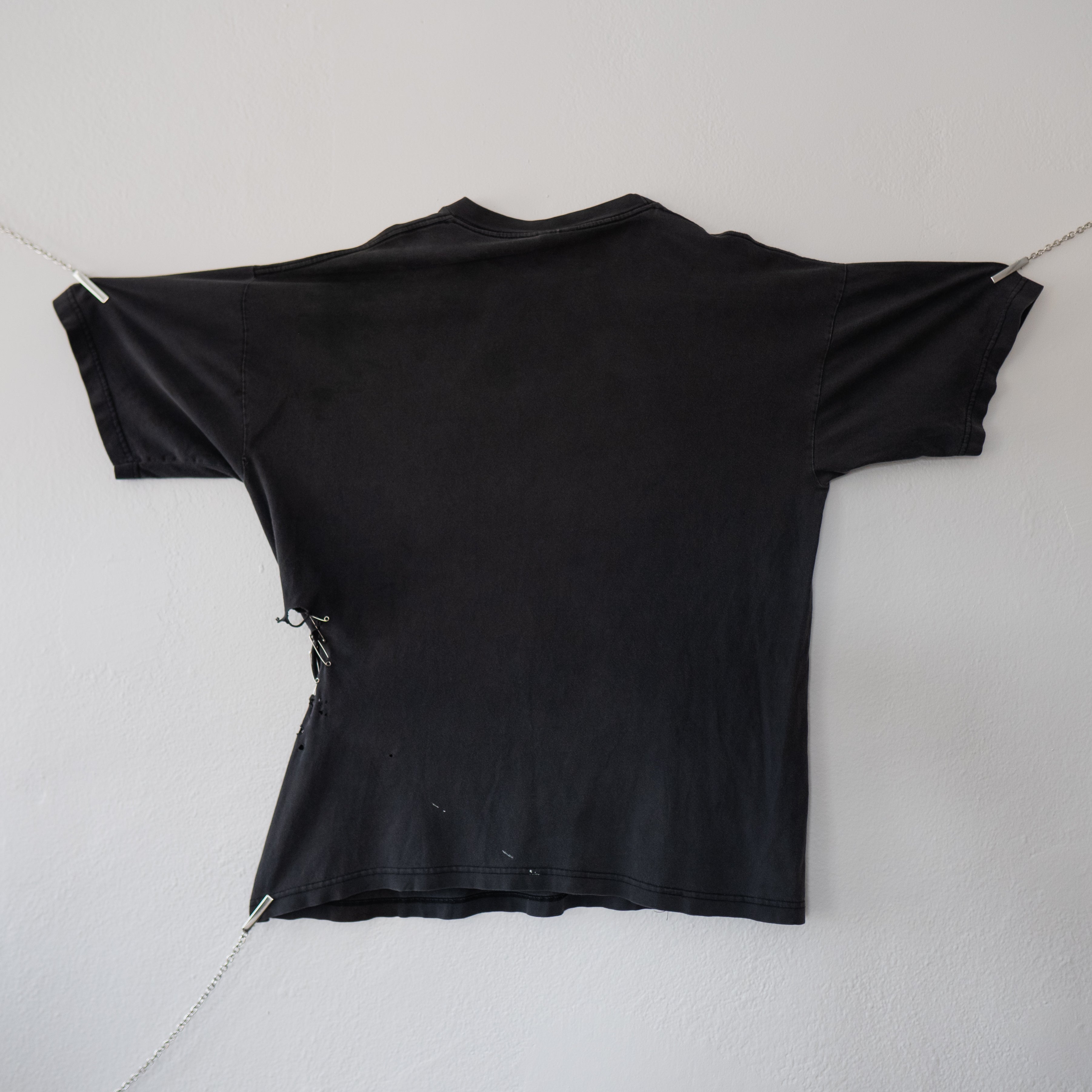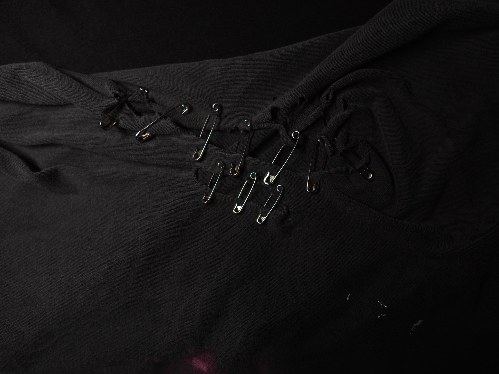 Tons of holes on left side of shirt, reworked with bobby pins. Stains on upper left shoulder.
