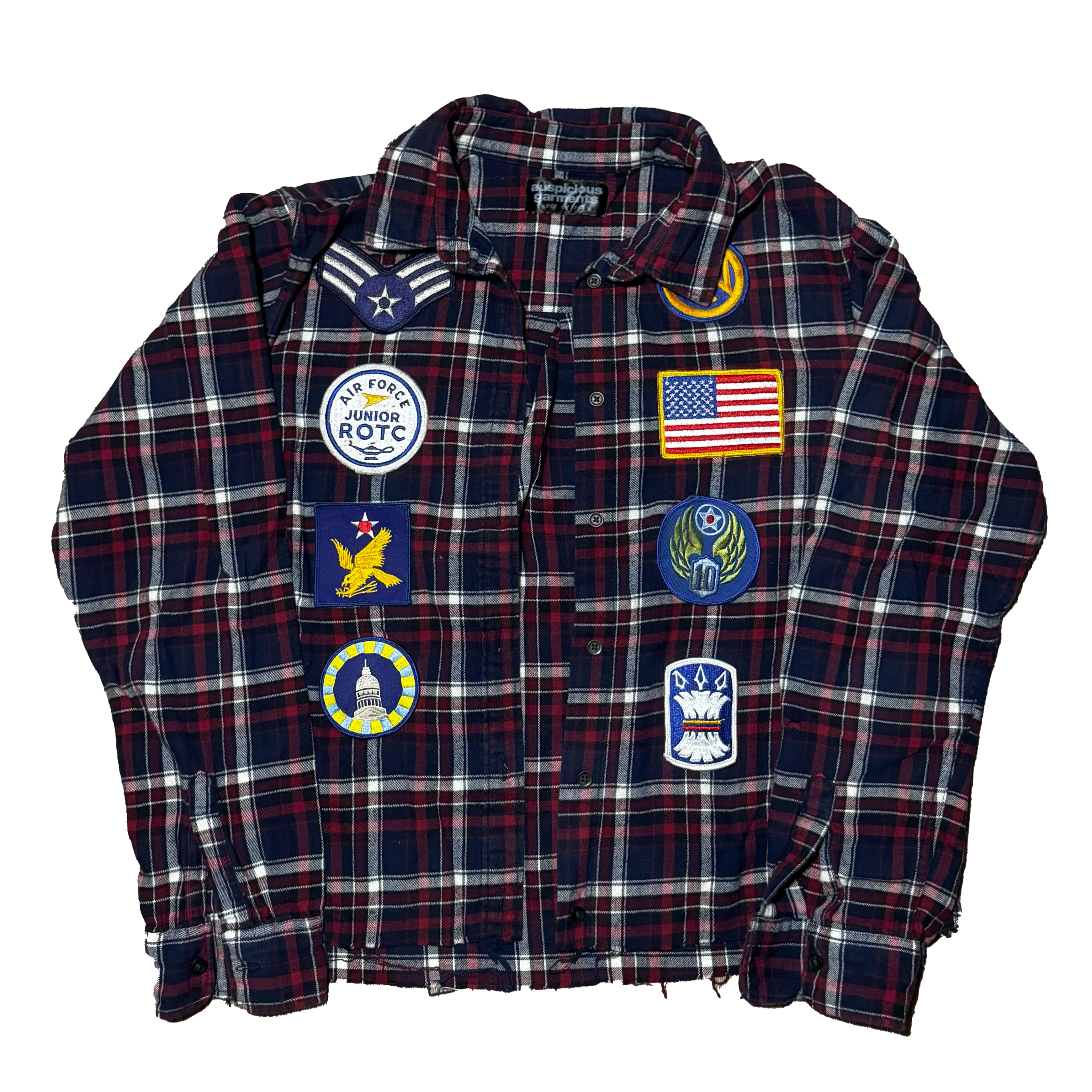 Cut and sewn in Austin, Texas. Brandishing vintage patches from all over the United States of America.