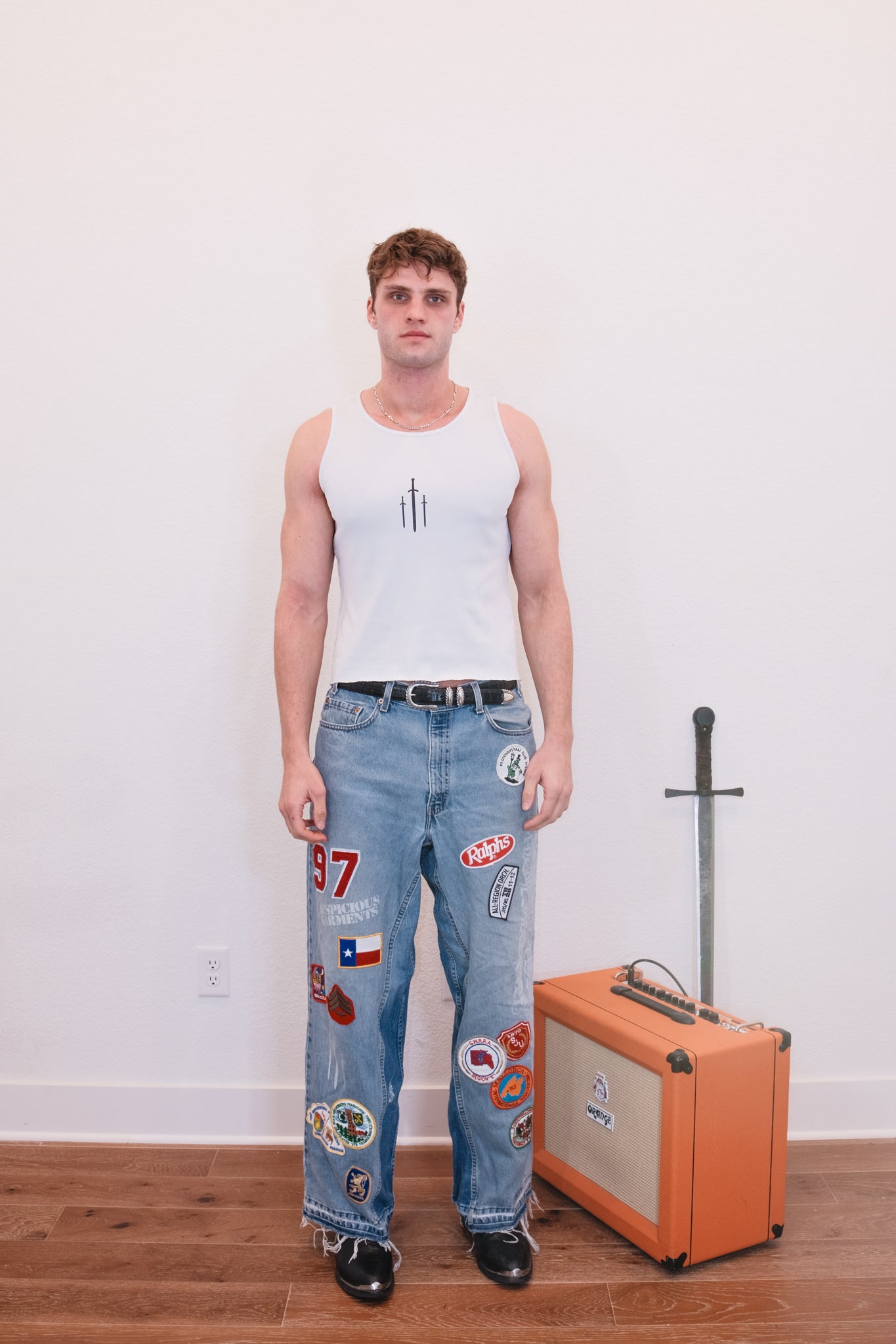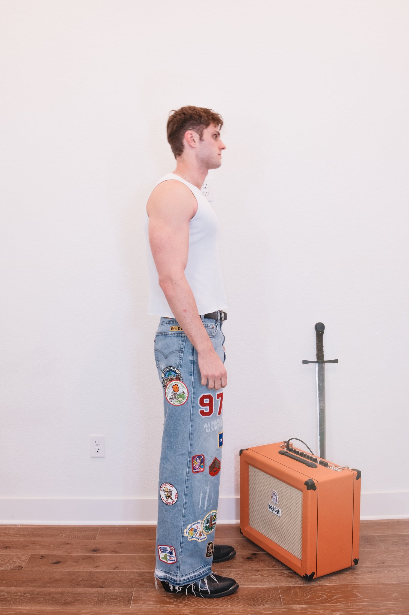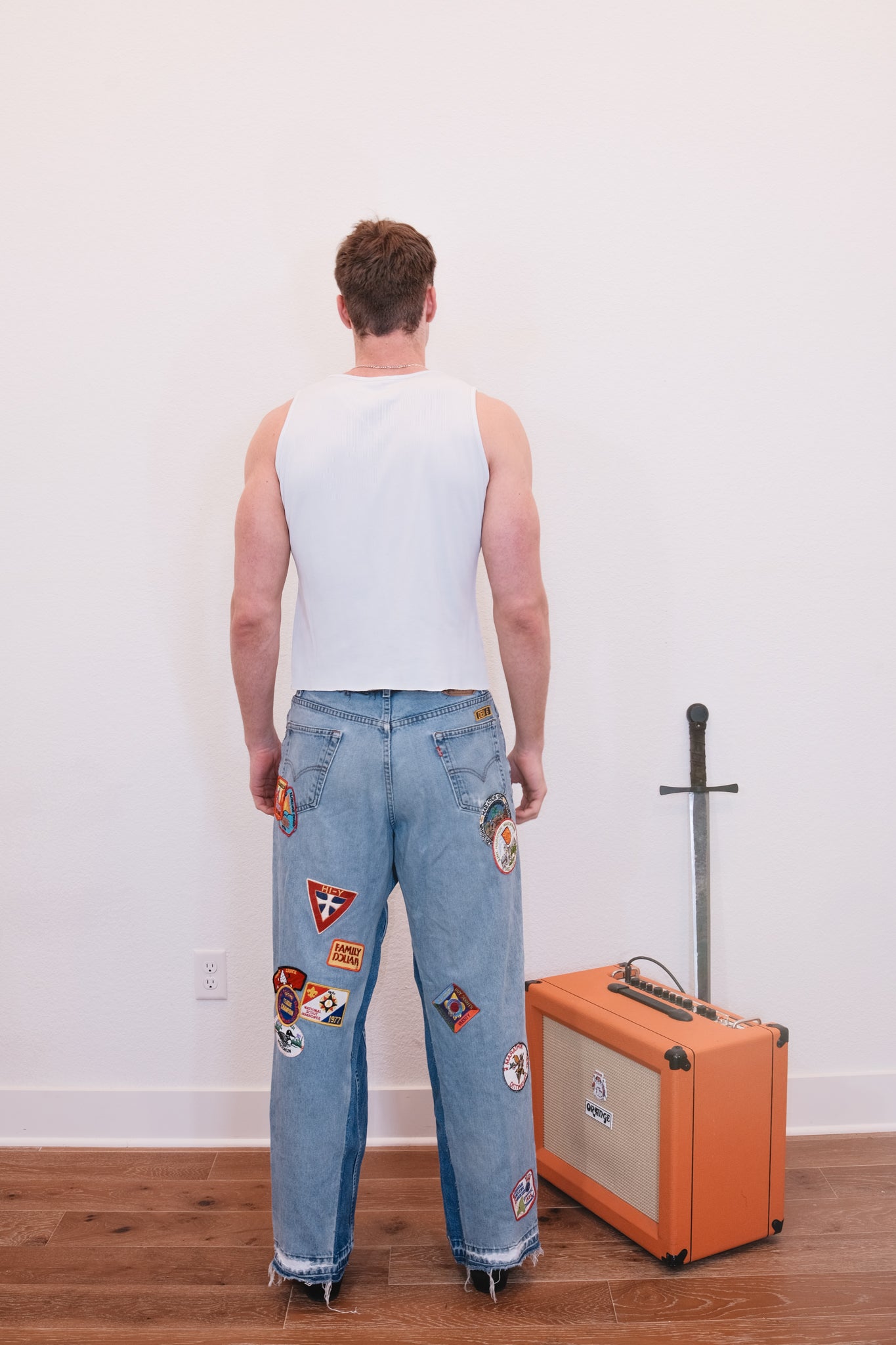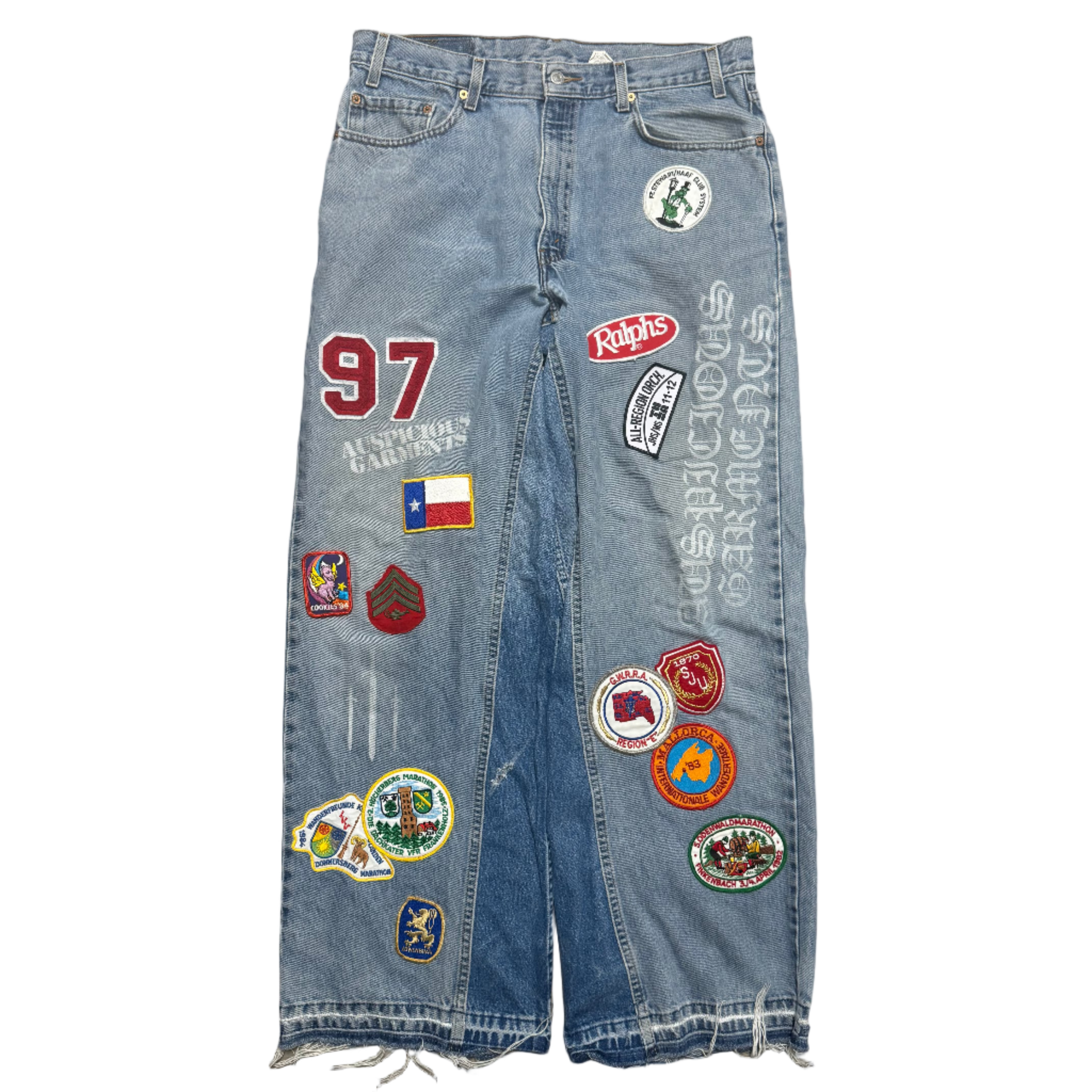 Jeans brandishing patchwork and screen printing.