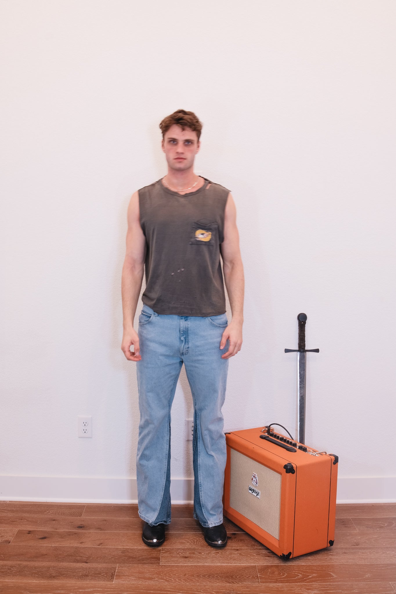Tagged Large, faded and thrashed, pin closures throughout back.